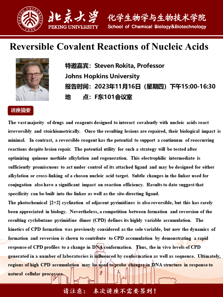 2023年11月16日(星期四),化学生物学与生物技术学院邀请了约翰霍普金斯大学化学系教授到访我院并进行Reversible Covalent Reactions of Nucleic Acids讲座,欢迎大家参加!