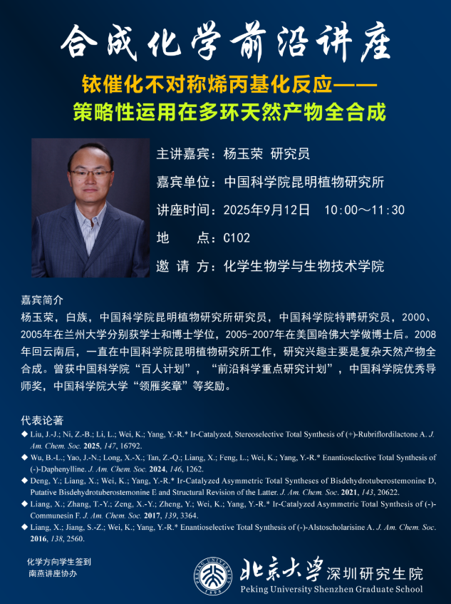 大家好,2025年9月12日(星期五),化学生物学与生物技术学院邀请了中国科学院昆明植物研究所杨玉荣研究员到访我院并进行“Ir催化不对称烯丙基化反应—策略性运用在多环天然产物全合成”的讲座,欢迎大家参加!