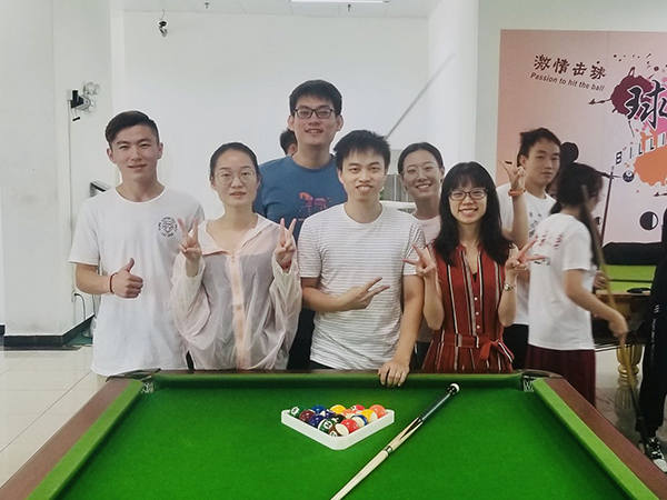紧随其后进行的是10月20日下午举行的台球团体赛。团体赛为五局三胜制,由各院系分别派出男女组合双打,单局定胜负,每人最多兼项两次。化生学院由陈城杰,廖柯,许经纬,张林星,付佳苗和吴博华组合出战,首场对阵上届卫冕冠军信工台球队。在紧张、刺激而又不失快乐的比赛氛围中,我院直落三局获得胜利,复仇成功。第二场对阵城规,在第一局化生组合濒临绝境的时候,对手出现失误将黑球进错袋,于是我院取得领先。而后的第二局第三局化生组合稳扎稳打,表现出彩,既有精准的长台进球,又有男女组合的良好配合,顺利拿下之后,由于在循环赛中的大局比分优势,化生院直接获得冠军,取得历史最佳成绩,充分展现了化生人顽强拼搏、勇争第一的运动精神。