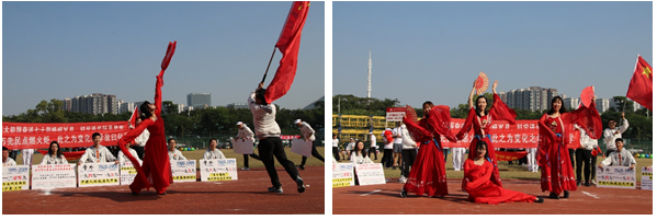 14点整,趣味运动会正式拉开帷幕。首先是各个学院运动员方阵的入场表演。化生学院的学生穿着整齐的服装,在常务副院长叶涛教授的带领下,迈着坚定的步伐,喊出了“青春如火,超越自我,化生出征,寸草不生”的口号。其中表演方阵令人眼前一亮——由十一位同学共同表演了化学版《生僻字》:马赵铭、谈心妤、徐炳琳和张鑫洋四位同学身着红装,用优雅飘逸的舞姿带给全场满满的中国风;其余同学手拿“头条式”的宣传语,回顾了建国70年以来中国医药界取得的骄人成就,向全院师生展现了化生人对科研的热爱与追求。富有创造力的表演,吸引了全场阵阵掌声与喝彩。