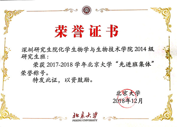 通过2018年10月18日在深圳研究生院集体奖励评审会的答辩竞选,化生学院2014级研究生班荣获2017-2018学年度北京大学“先进班集体”荣誉称号。