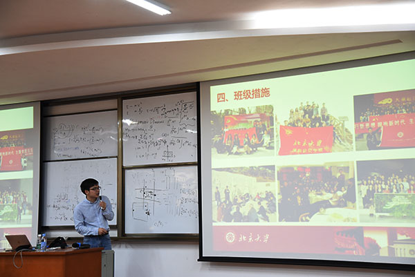 班会伊始,班长陆正昌、吴博华、谈心妤等3人带领同学学习校纪校规。陆正昌以“翟天临事件”、“北大马克思主义协会改组事件”、“北京大学三瓶可乐事件”为切入点,分别从学术道德,政治信仰,行为道德规范层面让同学们理解“扣好人生第一粒扣子”对于学习生活的重要性,引导同学对三个案例进行深入探讨,其间穿插校纪校规知识竞答。该部分学习最后,为了促进班级同学遵守校纪校规、促进班级同学团结向上,班委会提出了促进班级团结向上的已经实施的和拟实施的若干措施。