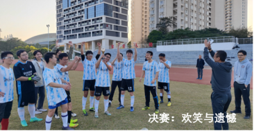 同样首发的还有李勇和陈可为,2021级的李勇作为化生新核,此役开场顶替邱晨,统领中场的攻防,他身边的陈可为则承担起了全场最艰难的盯防任务,这位被钱微从乒乓球桌上签下的球队新人,在五场比赛中展现出良好的天赋和学习能力,他本场比赛对信工核心球员的全程贴身防守,大大迟滞了信工的进攻锋芒,加之郭老师在后场的稳定拦截,信工难以创造绝对的进攻机会。下半场,彭涛老师和赵贝隶先后登场,有力的改善了球队的中场控制力,球队开始寻找机会发起进攻并创造了门前威胁,信工也利用个人能力制造出一些机会,但都被化生后防一一破坏,最终双方常规时间互交白卷,比赛进入了残酷的点球大战。彭涛老师第一个走上点球点,为球队先拔头筹,随后双方门将均发挥神勇相继扑出点球。然而,信工两轮点球先后命中,化生却不慎罚丢了最后一轮的点球。夕阳下的操场上,郭益安老师转过身来,留下了一抹忧郁的蓝白色。