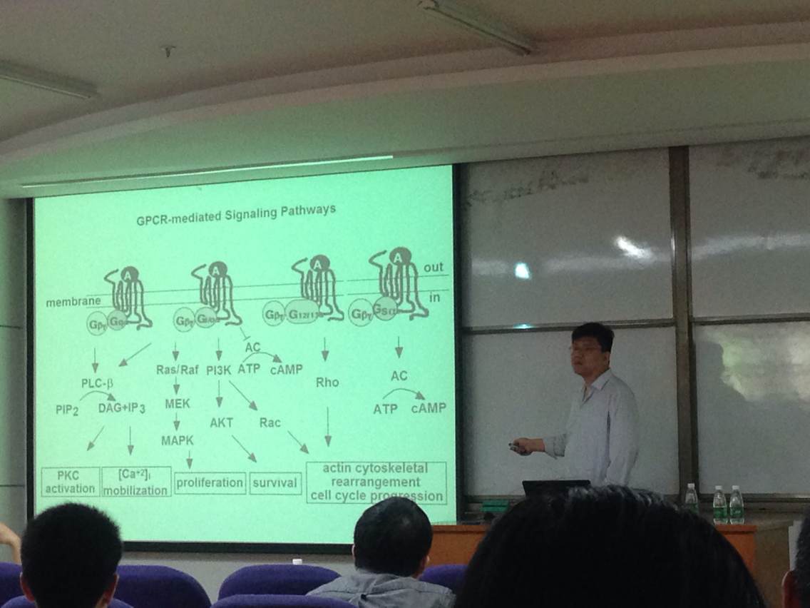 On the morning of April 25, 2014, professor Jinpeng Sun from The Shandong University School of Medicine gave an excellent report titled “Biased signaling of G protein coupled receptor” in E-104 at t...
