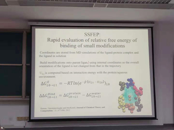 Firstly, Professor Alex MacKerell introduced the basics of computer-aided drug design. Rapid, accurate estimation of relative ligand affinities offers the potential to allow computational methods to direct drug design and development. Towards this goal MacKerell Group have developed two methods based on pre-computed ensembles: Site Identification by Ligand Competitive Saturation (SILCS) and Single-Step Free Energy Perturbation (SSFEP). SILCS is based on computational functional group affinity mapping (FragMaps) of proteins using oscillating μex Grand Canonical Monte Carlo/Molecular Dynamics (GCMC/MD) simulations that take into account contributions from protein desolvation, functional group desolvation, protein flexibility as well as functional group-protein interactions. In SSFEP a lead compound-protein complex is subjected to MD simulations from which an ensemble of ligand-protein conformations is obtained. Similar calculations are done on the ligand in solution. Free energy differences associated with small chemical modifications of the lead compound may then be evaluated using the free energy perturbation formulation in the context of single step perturbations.Secondly, Professor Alex MacKerel introduced the application of the above two methods in GPCR drug design.