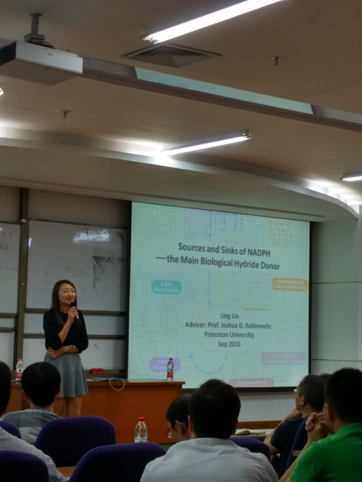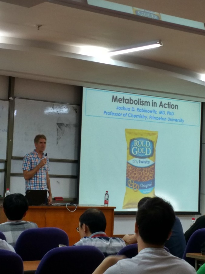 Prof. Joshua Rabinowitz used snacks to suggest the affection of nutrition to biological body and the key role of metabolism. The lecture was divided to four parts. In the first part, Prof. Rabinowitz introduced the method to investigate metabolism, were isotope tracers and LC-high resolution MS, using the “colored river” theory to trace metabolic products. However, the real thing is different because of the complex organism. In the second part, based on the “flux balance”, Prof. Rabinowitz found that lactate turned three times faster than glucose, and that TCA substrates were the main energy source even in cancer and hypoxia. He also discovered that tumors burned more lactate than glucose. In the third part, Prof. Rabinowitz’s student Ling Liu introduced the source and sinks of NADPH, which is the main biological hydride donor. She descripted the contribution of three different pathways in producing NADPH and different functions of NADPH in different cells. In the last part, Prof. Rabinowitz’s work indicated that the key enzymes’ mutation of folate metabolism may cause tumor.
