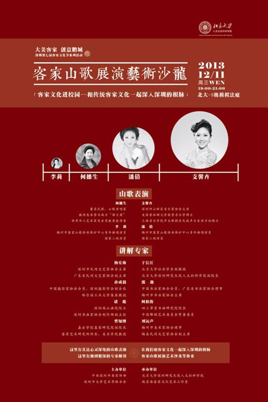 人文学院与深圳市委宣传部、深圳市文联于12月11日(周三)晚19:00在北大B栋模拟法庭举办“客家文化进校园——客家山歌展演艺术沙龙”活动,邀请了岭南地区颇负盛名的客家山歌表演艺术家和研究学者与大家一起分享客家文化的魅力,探寻其对深圳的影响力。诚挚邀请各位老师、同学参与我们的活动。