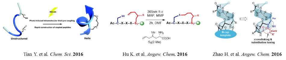 6) Tian, Y.; Li, J. X.; Zhao, H.; Zeng, X. Z.; Wang, D. Y.; Liu, Q. S.; Niu, X. G.; Huang, X. H.; Xu, N. H.; Li, Z. “Stapling of unprotected helical peptides via photoinduced intramolecular thiol-yne hydrothiolation”Chemical Science2016, 7, 3325.