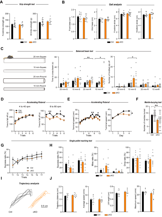 然后作者对FAT2敲除小鼠进行了系统的行为学检测,发现FAT2敲除显示在挑战性运动任务中缺陷——10mm圆柱平衡木通过时间显著延长,高速转棒测试仅在高速运动阶段显示运动协调能力受损,弹珠掩埋行为减少,但基础运动能力及精细前肢抓取任务均正常。旷场、高架十字迷宫、Y迷宫等行为学检测证实,FAT2敲除不影响认知、情绪或社交功能,提示FAT2特异性调控小脑依赖的复杂运动协调环路,而非广泛性神经功能异常。