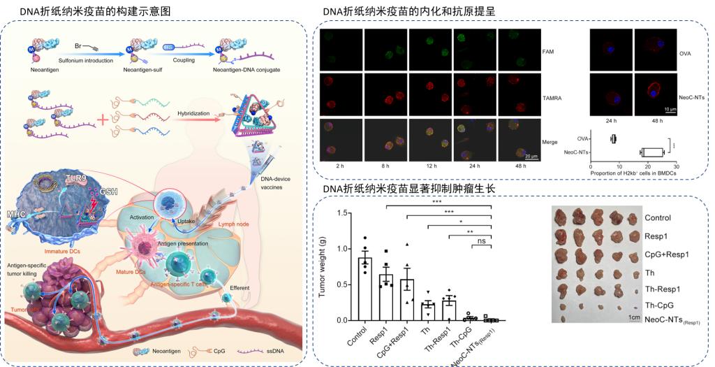 基于多肽的肿瘤新抗原具有良好的安全性、易生产等特性,由其制成的疫苗在肿瘤个性化免疫治疗的效果已在临床上得到验证。然而由于新抗原在肿瘤细胞表面表达丰度低、肿瘤异质性、以及多肽自身稳定性和穿膜能力有限等问题,导致新抗原肽疫苗的临床治疗效果一直不理想。新抗原肽的有效递送和可控释放是激活特异性、持续性免疫响应的关键。在众多纳米载体中,可编程的DNA折纸纳米载体可为药物提供精确的固定位置,具有作为智能型纳米递送载体的巨大应用潜力。