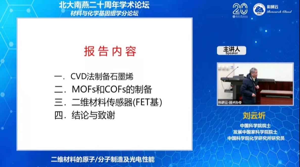 中国科学院院士、发展中国家科学院院士、中国科学院化学研究所研究员刘云圻做了题为《二维材料的原子/分子制造及光电性能》的报告。