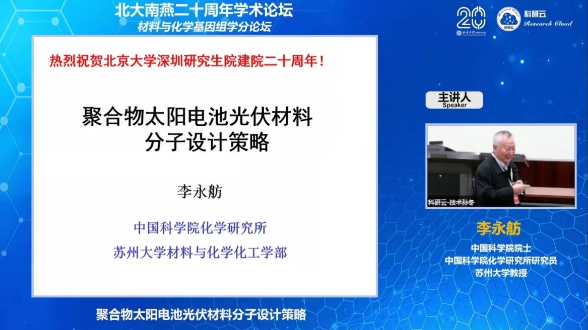 中国科学院院士、中国科学院化学研究所研究员、苏州大学教授李永舫做了题为《聚合物太阳能电池光伏材料分子设计策略》的报告。