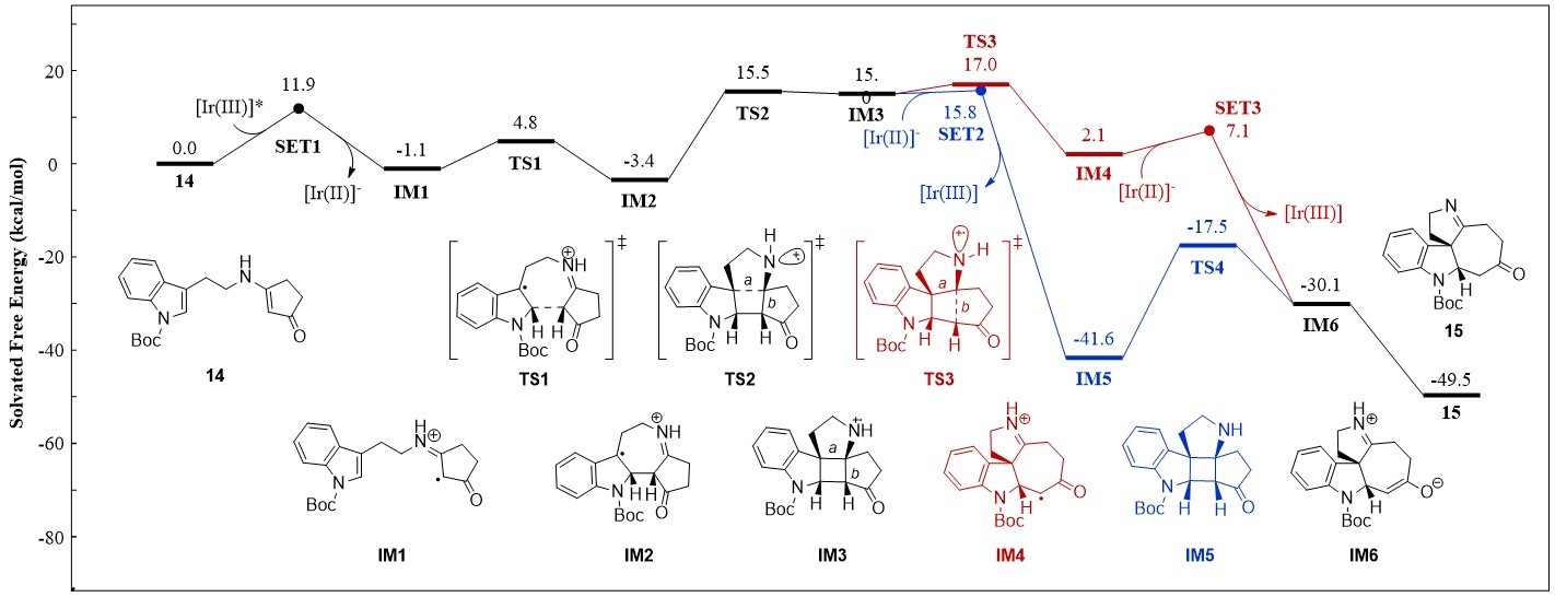 作者通过研究底物片段的荧光淬灭效应、对比可见光催化和紫外光催化的反应结果,判定反应是烯胺酮片段的电子转移历程,并由相关氧化还原电位确认该历程的可行性。随后,结合计算化学,验证底物被光氧化剂单电子氧化时,自旋密度主要分布于底物中的氧化烯胺酮片段上。通过考察多种质子化状态下的反应路径,发现中性分子势能面上的retro-Mannich反应在中性溶液中的活化能较高,难以发生;相反,自由基阳离子状态对应的势能面上,retro-Mannich反应仅需2 kcal/mol的活化能即可发生,并可经后续过程得到产物。