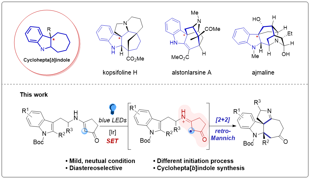 全碳季碳手性中心普遍存在于复杂天然产物和功能分子,具有重要的结构和功能意义。立体选择性构筑高空间位阻的全碳季碳、甚至连续季碳是有机合成的重点和难点。C-3位为全碳季碳的cyclohepta[b]indole结构,广泛存在于复杂活性天然产物,具有重要的医药和化学研究价值。可见光催化吲哚去芳构化的[2+2]环加成反应近来受到广泛关注,但目前报道的该类反应均依赖于吲哚片段与光催化剂的能量转移过程。杨震课题组发展了一种光催化氧化烯胺酮基团诱导启动的形式[2+2]/retro-Mannich反应、完成了吲哚去芳构化并立体选择性构建了cyclohepta[b]indole结构。