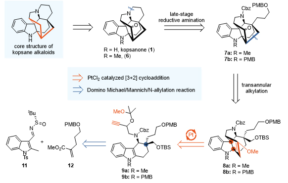 北京大学深圳研究生院叶涛课题组长期致力于具有显著结构特征和优良生物活性天然产物及其类似物的全合成研究。近期,该课题组开发了一类PtCl2催化的分子内[3+2]环加成反应,并将该[3+2]环加成反应应用到生物碱Kopsane家族分子的不对称全合成中,完成了kopsanone,kopsanol,epi-kopsanol,10,22-dioxokopsane和N-methyl-10,22-dioxokopsane以及衍生物N-methyl-kopsanone的全合成。这一高效的合成路线采取了Michael-Mannich-N-烷基化串联反应、PtCl2催化的分子内[3+2]环加成、SN2-type环化等反应作为关键策略,同时该课题组还与韩国梨花女子大学的Sun Choi教授课题组合作,通过计算化学的方法进一步揭示了PtCl2催化的分子内[3+2]环加成反应的历程。