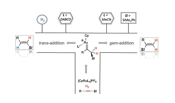 吴云东课题组对此进行了理论研究。DFT计算首先排除了传统的亚乙烯基机理。反应的第一步与硅氢化反应等机理类似,经过氧化性氢金属化形成三元环中间体,但第二步不是直接发生还原性氢迁移到另一个碳原子,而是氢再次迁移到同一个碳原子上形成稳定的卡宾中间体。该中间体已由Fürstner小组通过NMR证实。卡宾中间体可能沿着两条反应路径走,一条是硅基发生1, 2-迁移形成gem-加成主产物;另一条是结合另一分子H2 发生氧化加成,氢迁移和ß-氢消除得到trans-加成产物。这与实验中高浓度H2更有利于trans-加成一致。计算还发现用PhMeSi取代炔烃时,苯环可以和Ru中心结合降低gem-加成的能垒,获得更高的选择性。而加入拥挤的DABCO后,空间位阻导致硅基迁移的能垒升高,从而利于trans-加成。进一步的机理验证实验排除了亚乙烯基机理,交叉氘代实验支持了Ru-卡宾反应机理。