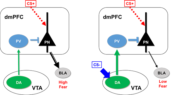 恐惧记忆形成可以帮助动物预测其周围环境的安全性,以此规避潜在危险,而对安全信号的准确学习,则可以帮助动物从持续的恐惧状态中释放出来,促进进食、探索或交配行为。因此,成功抑制习得的关联性反应对生存和心理健康至关重要。这一功能在诸多精神类疾病如创伤后应激障碍(Posttraumatic Stress Disorder,PTSD)中都出现了缺损。这种抑制性条件学习过程被称为条件性抑制,但其确切的生物学机制尚不清楚。本研究在经典的巴甫洛夫条件性学习的行为学基础上,采用条件性恐惧训练及安全学习作为条件性抑制的模型,利用多种技术手段、在诸多层面分析了与危险信号CS+和安全信号CS-相关的行为学、神经元放电活动及神经环路的改变。本研究的重要发现是安全学习导致相关的VTA部位的DA神经元活动增加,进而引起dmPFC的parvalbumin抑制性神经元活性增加,并最终降低小鼠的恐惧记忆的表达。此外,本研究还发现此DA依赖的安全学习过程在PTSD疾病动物模型中受损,并与VTA的DA神经元功能异常有密切关联。