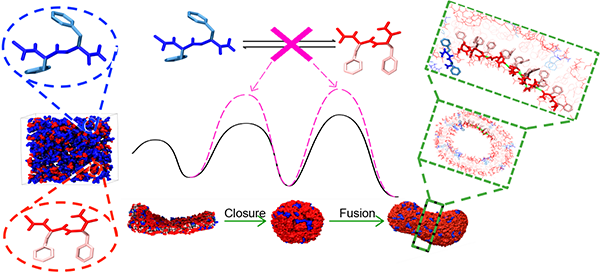 多肽自组装材料近年来因其简单易得,良好的生物相容性和生物可降解引起了广泛的关注,逐渐在生物材料、环境材料、光电材料、医学材料等领域大放异彩。如何合理地的设计多肽的分子结构从而获得特定的自组装纳米结构是多肽自组装材料研究的核心科学问题。多肽自组装材料的分子设计很大程度上依赖于对多肽分子复杂多变的构象特征与多肽自组装行为之间关系的深入理解。运用现有的实验技术实现对多肽自组装过程中构象细节的表征颇具挑战。计算机模拟是一种与实验测量互为补充的表征技术,可以提供实验上难以捕捉到的分子细节。然而,由于多肽自组装体系过于复杂,运用计算模拟观测这个过程的结构细节还十分困难。为了克服这些计算上的技术挑战,研究团队发展了一套高效的多尺度多肽模型,并运用该模型对数千个苯丙氨酸二肽(FF)分子的自组装过程进行了大量的计算模拟,首次观测到FF自组装过程中构象变化的分子细节,并深入地探讨了多肽构象在这个过程中所起的作用。