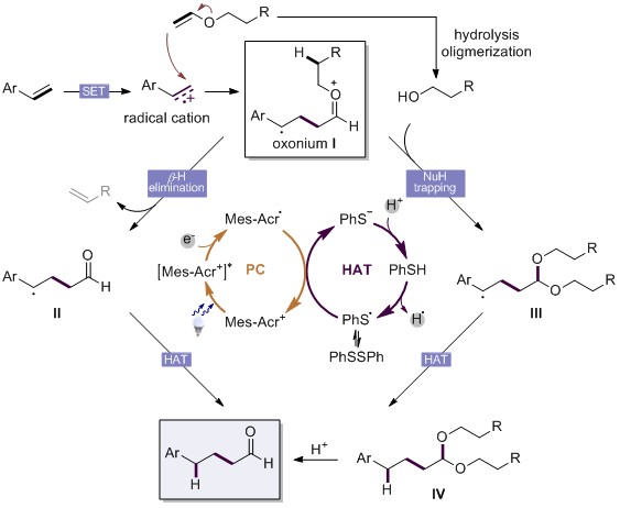 通过机理实验证明,该反应在可见光催化条件下,有机光敏剂对苯乙烯类底物进行单电子氧化,形成高能的自由基正离子物种 (Radical cation),接受烯基醚的亲核进攻得到氧鎓中间体 (Oxonium I),后续反应或通过β-氢消除及氢转移步骤 (Hydrogen atom transfer, HAT),或经过醇捕获、氢转移及水解步骤,实现多种取代类型脂肪醛化合物的高效构建。