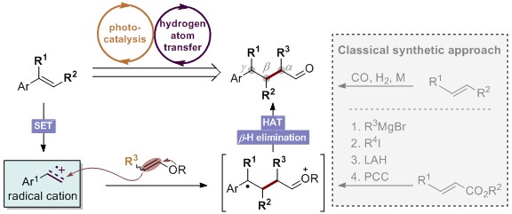 醛基是一类重要的官能团,在合成化学中有着广泛的应用,可进行多种化学转化,并作为复杂骨架的关键合成子。然而,非线性脂肪醛类化合物在合成上较具挑战性,在已有的报道中,大多需要比较苛刻的反应条件或者相对繁琐的转化步骤,且面临区域选择性的问题。而对于α,β,γ连续取代的醛类化合物,目前尚无任何合成报导。2017年,北京大学深圳研究生院黄湧教授课题组与北卡罗来纳大学教堂山分校David A. Nicewicz教授合作发展了有机光敏剂与氢转移试剂的协同催化策略,单电子氧化苯乙烯类化合物,利用关键的自由基正离子中间体实现高度选择性的杂二聚反应,同时以高非对映选择性(dr > 20:1)合成一系列多环骨架 (Angew. Chem. Int. Ed. 2017, 56, 6896-6900)。基于这一创新性的协同催化策略,近期该研究团队利用可见光诱发单电子转移 (Single electron transfer, SET),在温和条件下一步合成多种取代类型的脂肪醛类化合物,成果发表于德国应用化学,题为“Direct Synthesis of Polysubstituted Aldehydes via Visible-Light-Catalysis” (Angew. Chem. Int. Ed. 2018, DOI: 10.1002/anie.201712384)。