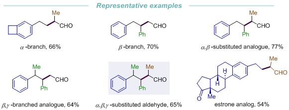 这一工作以有机染料吖啶盐 (Mes-Acr+) 作为有机小分子光催化剂,二苯二硫醚 (PhSSPh) 作为氢转移催化剂,实现了脂肪醛类化合物的高效合成。基于该策略的协同机制,可在室温条件下以较高的收率获得:α或者β-单取代,α,β或者β,γ-双取代,以及α,β,γ-三取代的脂肪醛类化合物。在衍生应用中,这一协同催化机制亦可有效实现复杂骨架的后期修饰,引入特殊的脂肪醛基侧链作为天然产物多官能团化修饰的关键介导。