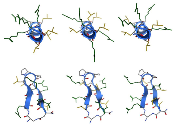 图2:具有不同拓扑结构分布的构象稳定的两亲性穿膜肽的分子三维结构示意图。其中绿色为亲水性残基,黄色为疏水性残基,灰色为主链。