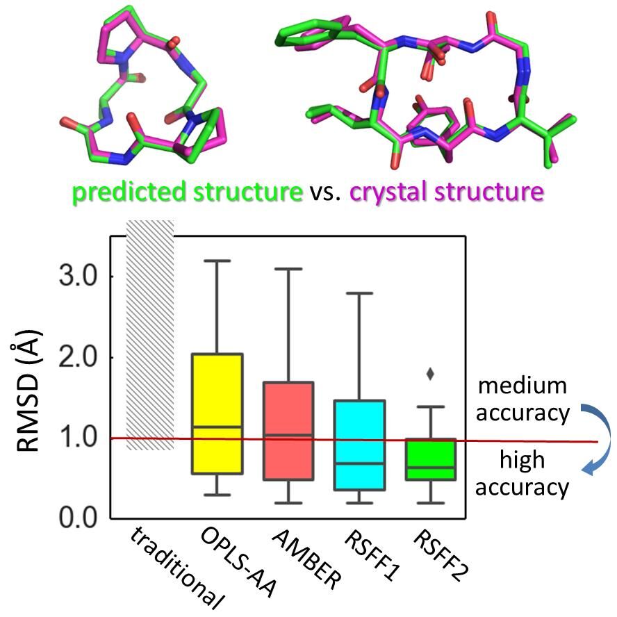 该工作使用吴云东课题组发展的RSFF2力场,可以准确地预测出20个环肽中的17个,与晶体结构的均方偏差(RMSD)小于1.1Å。新方法的准确度明显高于之前的方法。另外,还发现相对于线性多肽,环状多肽的构象取样与球蛋白更相似,为环状多肽在药物设计中作为蛋白分子的替代物提供了理论上的支持。