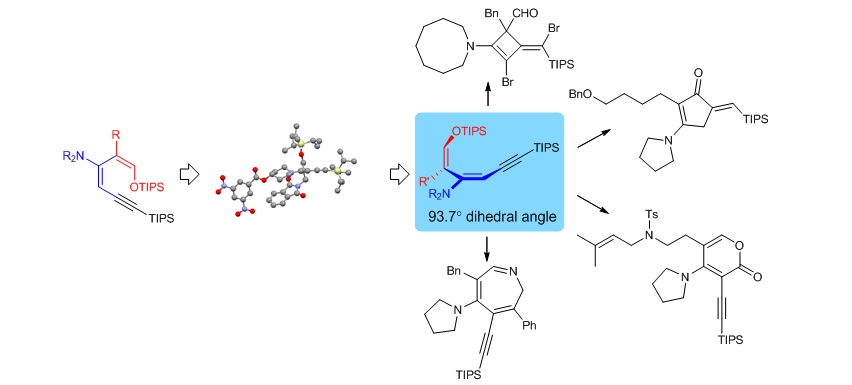北京大学深圳研究生院黄湧课题组最近发展了一个1,2,3,4-四取代丁二烯的合成方法。该反应条件温和,不需要任何催化剂或添加剂,具有高度的原子经济性。他们进一步发现这类分子不同于其他双烯,相邻的双键不是平面共轭结构,而是以近90度的二面角扭曲。因此,该双烯并不参与常规的环加成反应。研究人员进一步发现,这类炔二烯胺结构在不同的亲电试剂作用下,可以发生一系列新颖的环化、重排反应,生成多种环系(4到7元环)骨架,为双烯在非环加成中的合成应用,提供了新的思路和策略。研究结果发表于自然通讯杂志上(Nature Communications, 2015, 6, 6913)。该工作得到了中国国家自然科学基金(21372013)、深圳市孔雀计划项目(KQTD201103)的资助。